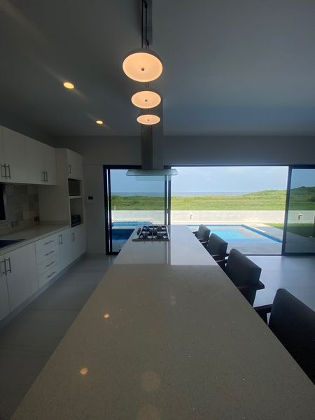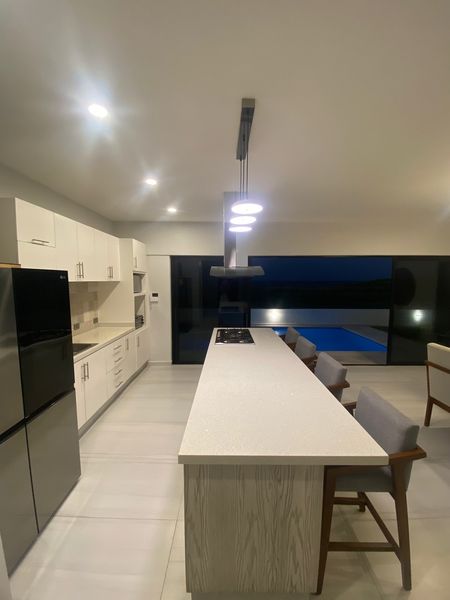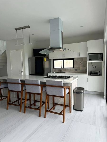 -Cocina integral equipada con isla central de cuarzo, parrilla, campana y horno