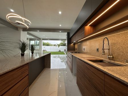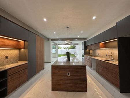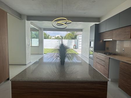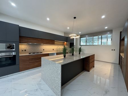 Distribuida en dos niveles, cuenta con 3 amplias recámaras en planta alta, cada una con baño propio, la recámara principal con gran vestidor acabado en fina madera, con diseño espectacular y el baño de esta recámara es realmente acogedor y con los mejores acabados. En total son 5 baños completos, estancia de TV, sala, comedor, y una cocina de diseño exclusivo fabricada por Kuben, equipada con acabados y materiales de alta gama. Además, incorpora espacios pensados para el entretenimiento como un bar interior (preparación), pérgola con asador, y una alberca con jacuzzi que invitan al descanso y la convivencia.