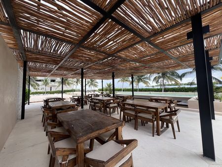 con servicio restaurante, kayac, camastros, baños, vestidores, etc.