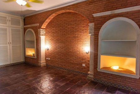 Recamara 2. Piso de laja de San Luis Potosí, sala de tv, estudio con cascada y cúpula de ladrillos, puerta de madera con vitrales, baño completo con 2 lavabos, gran closet.
