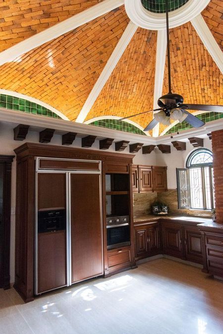 Cocina. Cúpula de ladrillos, granito, mueble de madera, nevera especial para la casa, alacena.