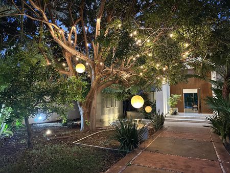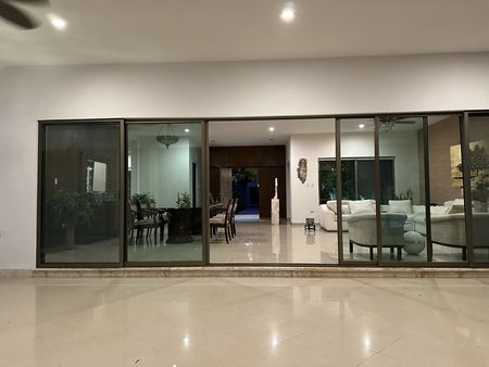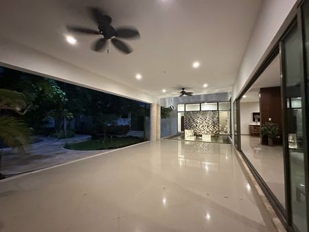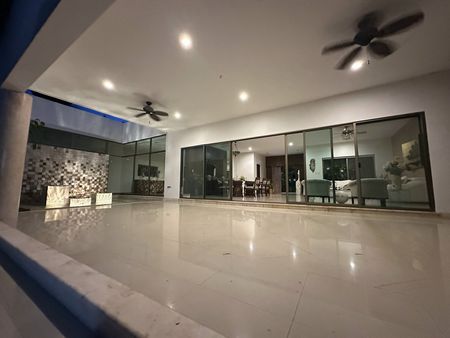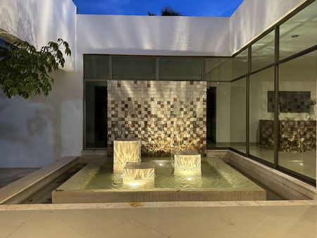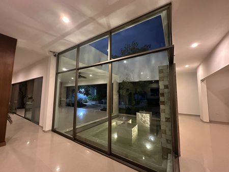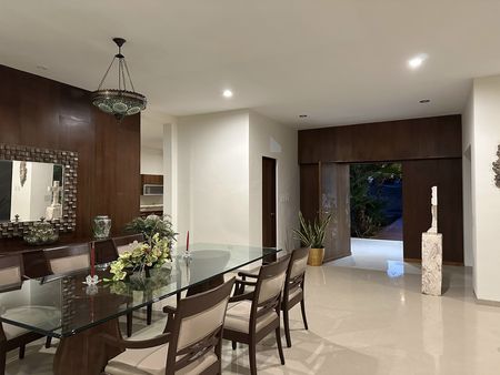 Construída en un diseño contemporáneo sobre un terreno de 2096 metros cuadrados (30 metros de frente x 69 metros de fondo consultar plano) en una sola planta, con una antigüedad de 7 años. La residencia cuenta con espacio de estacionamiento para 12 vehículos: 3 techados y 9 sin techar. Un amplio jardín con corredor y fuente a la entrada principal.
