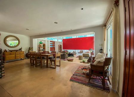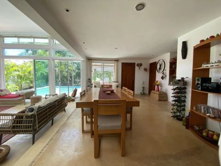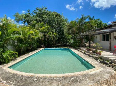 El área social se abre hacia una piscina de gran tamaño con terraza y jardín trasero arbolado, perfecta para disfrutar de la vida al aire libre.