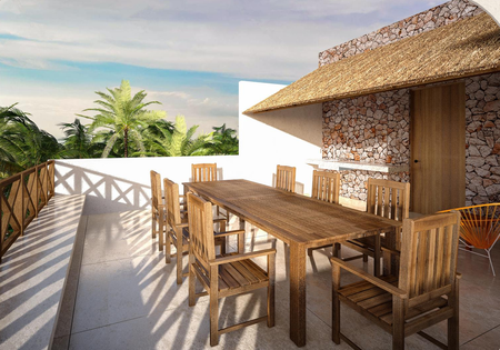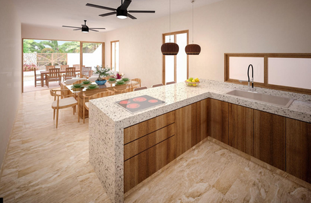 - Cocina y rooftop: Granito Tulum.
