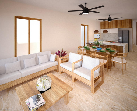 - Sala, comedor y cocina en concepto abierto.