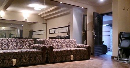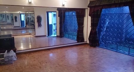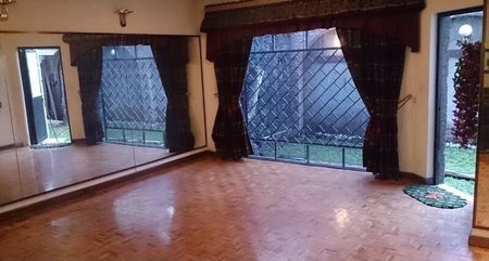 - Salón para fiestas / juegos / ejercicio de 6.9 x 6.2 metros y altura 2.85 m, con espejos de pared a pared y piso a techo, piso de parquet, puerta frontal de gruesa herrería ornamental, puerta trasera de aluminio, con vista y acceso a jardín