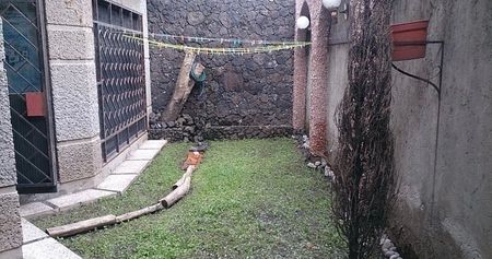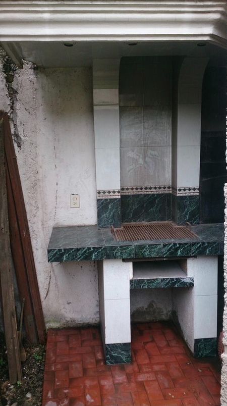 - Jardín de 10 x 3.3 metros, con asador techado, y arcos con grava (de granito?) de un lado, roca