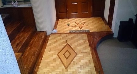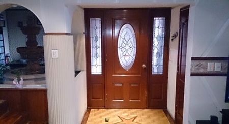 - Lambrín de caoba de piso a techo y pared a pared en uno de los lados, con cenefas verticales de espejo