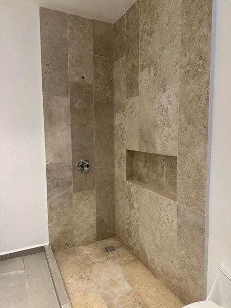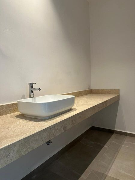 1 Recámara con baño completo con una meseta de mármol, lavabo de sobreponer e inodoro de una pieza.