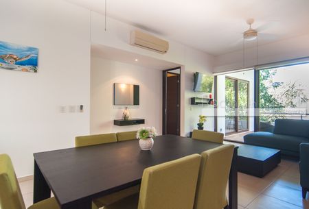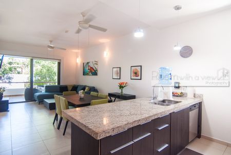 Este luminoso y espacioso departamento de 2 recámaras y 2 baños en TAO Residential, Akumal, ofrece el equilibrio perfecto entre confort moderno y estilo de vida tipo resort en el corazón de la Riviera Maya. Su diseño de concepto abierto incluye una cocina con electrodomésticos de alta gama, una amplia sala y comedor, además de un cuarto de lavandería. Las grandes puertas corredizas de vidrio en la sala y la recámara principal se abren a un balcón techado con vistas a la selva, ideal para disfrutar del café por la mañana o relajarse por la tarde. Este departamento está completamente equipado y listo para habitar, con amplio espacio de almacenamiento, pisos de loseta y acabados de alta calidad.