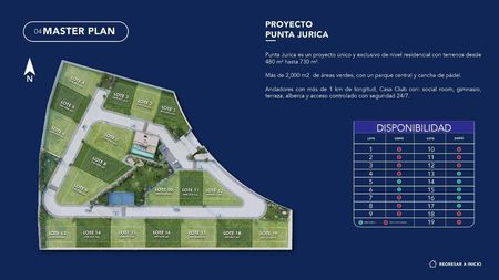 Residencial Punta Jurica se distingue por la exclusividad que ofrece a nivel residencial, 19 lotes con terrenos desde 533 m2 hasta 593m2. Cuenta con más de 2000 m2 de áreas verdes, parque central y cancha de pádel.