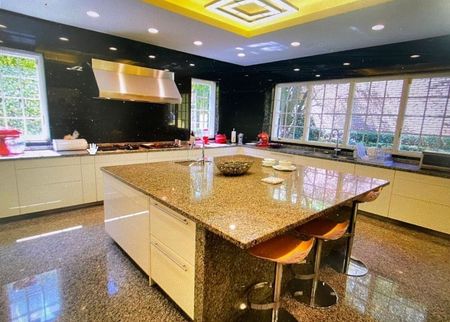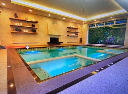 Estacionamiento para 10 coches techado , recibidor , alberca propia , jacuzzi y chapoteadero, cuarto de masaje , sala de belleza, baño completo con sauna y vapor, cuarto de servicio, cuarto de choferes con baño, cuarto de máquinas,?dos bodegas , elevador, planta de luz, aire acondicionada , calefacción, sistema de vídeo, vigilancia de máxima seguridad en toda la casa .