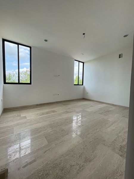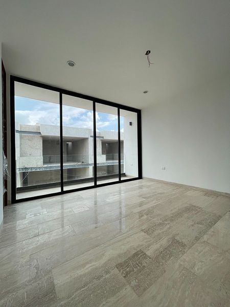 Recámara principal con espacio de closet vestidor, baño completo con doble lavamanos y balcón