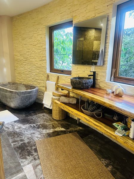 Hermosa escalera de madera en forma de caracol que te lleva al 1er piso, donde se encuentran dos recámaras más: la Master suite con clóset y hermoso baño con tina y la segunda recámara con clóset y baño. Ambas con una hermosa vista al cenote.