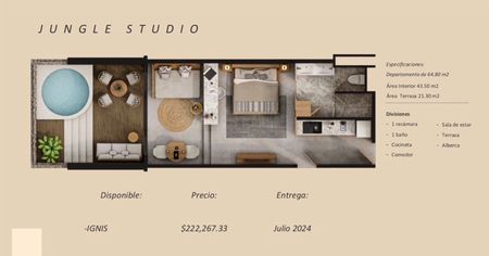 * IGNIS Torre con 41 unidades, áreas comunes y amenidades como la alberca fuego con snack bar y en su Rooftop, una zona de relajación y esparcimiento o lectura con jacuzzi para hasta 20 personas y salón de usos múltiples, ideal para practicar yoga y eventos privados.