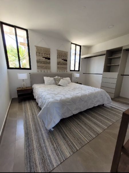 • Equipamiento: Parrilla eléctrica 4 quemadores, gavetas inferiores y superiores en cocina, closets semi vestidos, cancel fijo de cristal templado en baños, calentador eléctrico, meseta granito blanco, pisos cerámicos.