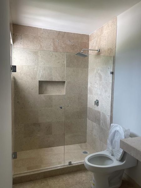 en baños (un fijo y puerta abatible), barandal de vidrio templado en balcón trasero,