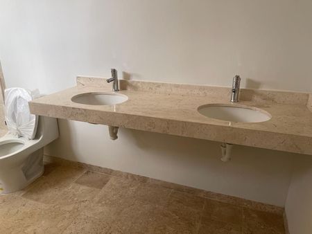 300 lts, escalera cubierta de mármol travertino Fiorito, canceles de vidrio templado