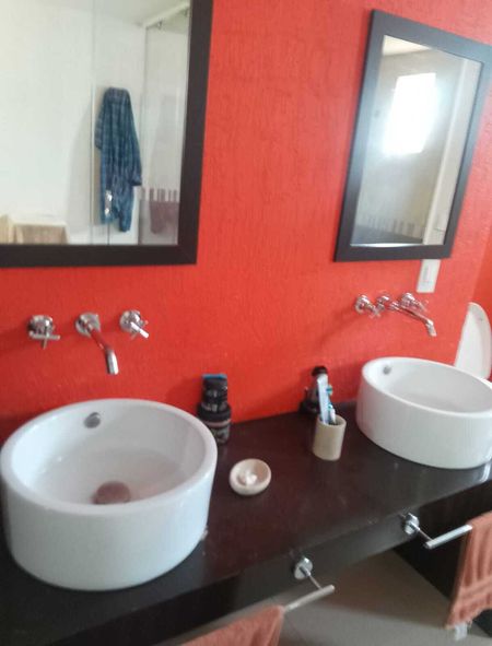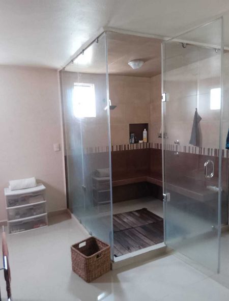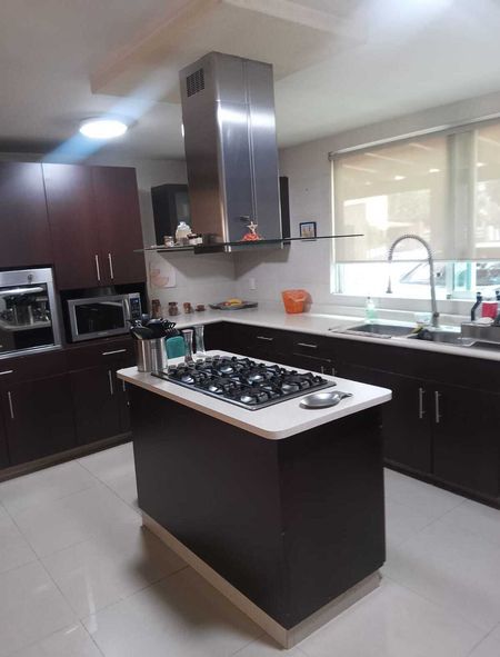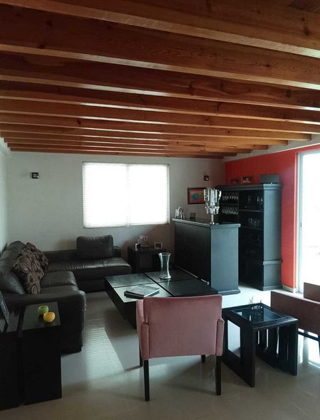 PB. Cochera techada para 3 autos, el jardín llega hasta la parte de atrás, estancia, un estudio, 1/2 baño, sala con techo de madera, comedor, cocina con isla, desayunador, cuarto de servicio, área de lavado.
