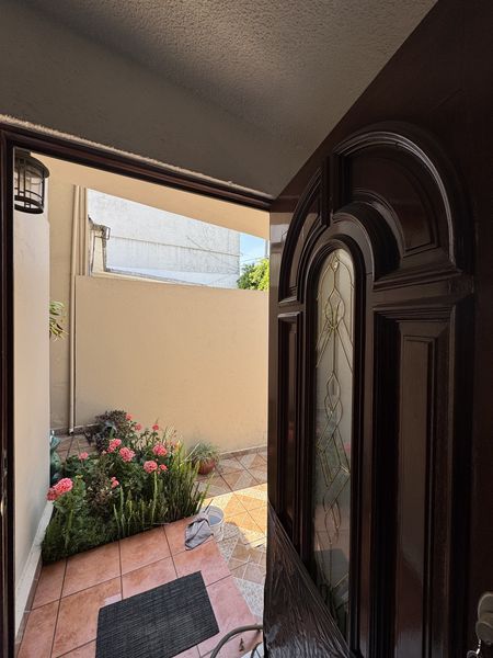 Su marquesina protege sus puertas vehiculares y al centro se encuentra una puerta peatonal, la cual te recibe cálidamente al entrar a ella al fondo, puedes percibir la fachada y un jardín frontal, subiendo tres escalones. Llegas a la puerta principal.