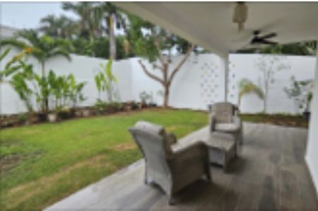 Terraza techada con piso cerámico imitación madera y dos ventiladores marca Hunter