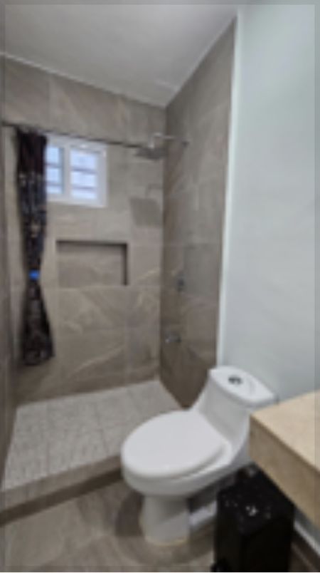 baño con inodoro de 1 pieza, lavabo con meseta de cantera y regadera con llave mezcladora