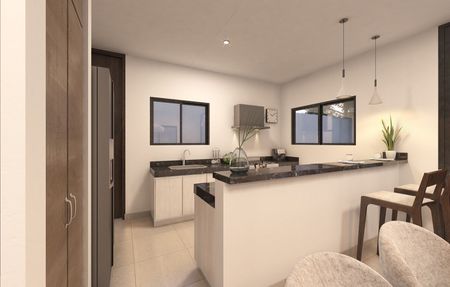 Cocina con barra desayunadora y alacena vestida con gavetas incluidas.