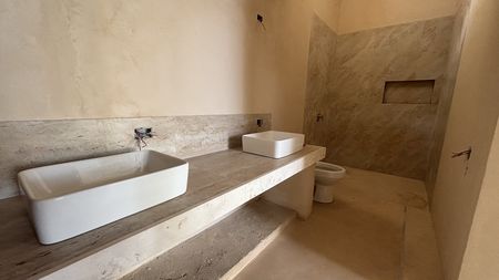 Recámara secundaria con closet vestidor y baño completo con doble lavabo