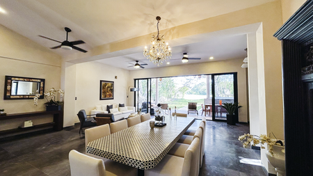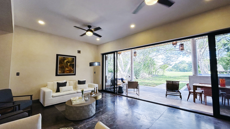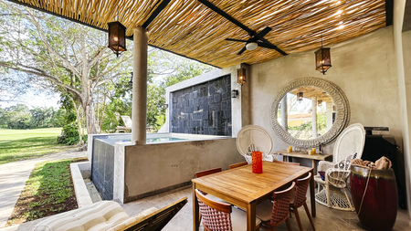 - Garaje lateral techado para 3 vehículos, con una sombra de bajareque.