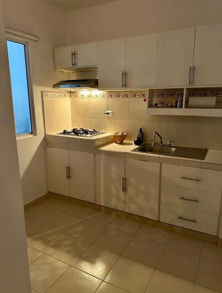 EQUIPADA CON:Cocina vestida con gavetas de madera, parrilla a gas empotrada y campana extractora con iluminación.