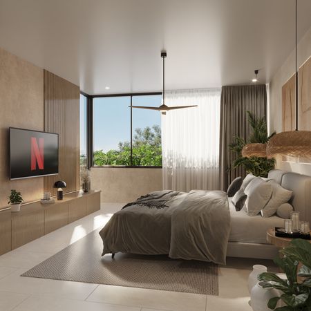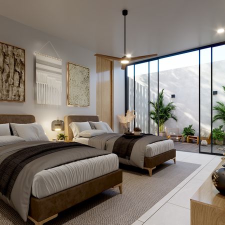 -Recamara secundaria con ventanal panorámica hacia terraza con closet de pared, escritorio home office y baño completo