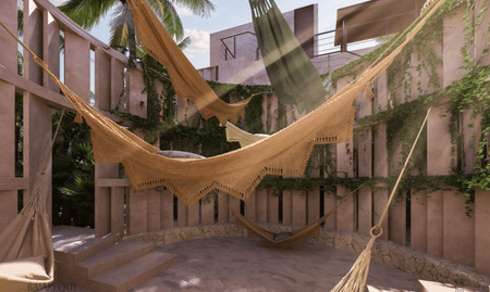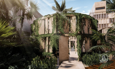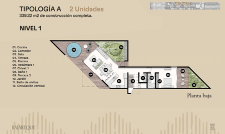Planta baja: acceso peatonal y vehicular, áreas de uso común tanto exteriores como interiores (amenidades) + recepción, área administrativa, servicios de cocina, baños, área de servicios.
