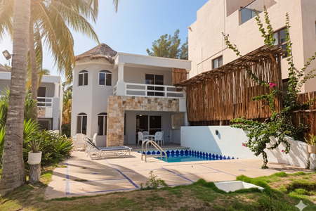 Elevador principal con acceso directo al garden house, puerta blindada, medio baño para visitas, amplia estancia sala-comedor con bar, balcón y puerta de acceso del jardín común, cocina integral equipada (con horno, lavavajillas, refrigerador) con cubierta de granito, con isla-antecomedor, alacena, cuarto de lavado con lavadora y secadora, cuarto de servicio con baño, 176 m2 de terraza interior. Recámara principal con balcón, amplio walk in closet y baño con jacuzzi y regadera, 1ª recámara junior con walk in closet baño y ventanal de acceso a la terraza interior, 2ª recámara junior con walk in closet y baño. Acabados de lujo: cocina con cubierta de granito, pisos de madera de ingeniería de 17 mm, carpintería de encino, piso de porcelanato en pasillos, baños y cocina, baños con acabados en mármol y cancelaría de vidrio templado, Iluminación LED y sistema de sonido inteligente, calefacción con controles independientes en cada área del departamento. Incluye cortinas, persianas eléctricas, televisión de 80 pulgadas y toda la línea blanca de lujo. Todos los muros son de concreto. Ningún muro colinda con el departamento contiguo. Terraza interior con sistema de riego por aspersión, cisterna con doble sistema hidroneumático, planta de tratamiento de agua para riego, estricta vigilancia 24 horas con CCTV. Ubicado en Tecamachalco, entre Av. Paseo de las Palmas y Av. De las Fuentes.