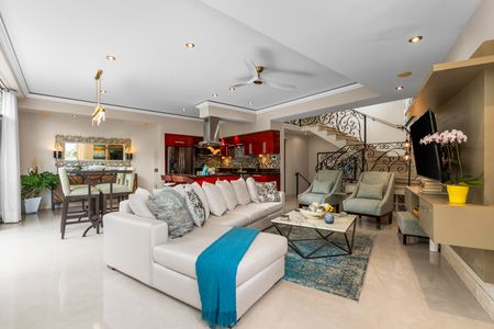 Tiene techos doble altura, con 16 baños, amplios espacios interiores y una construcción de aproximadamente 740 m2 y 800 m2 de superficie.