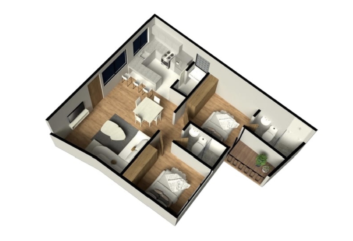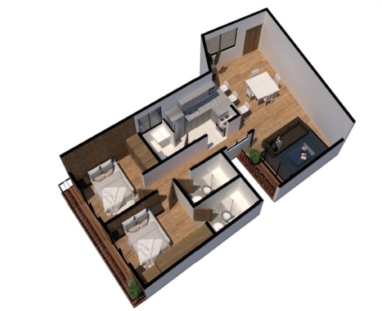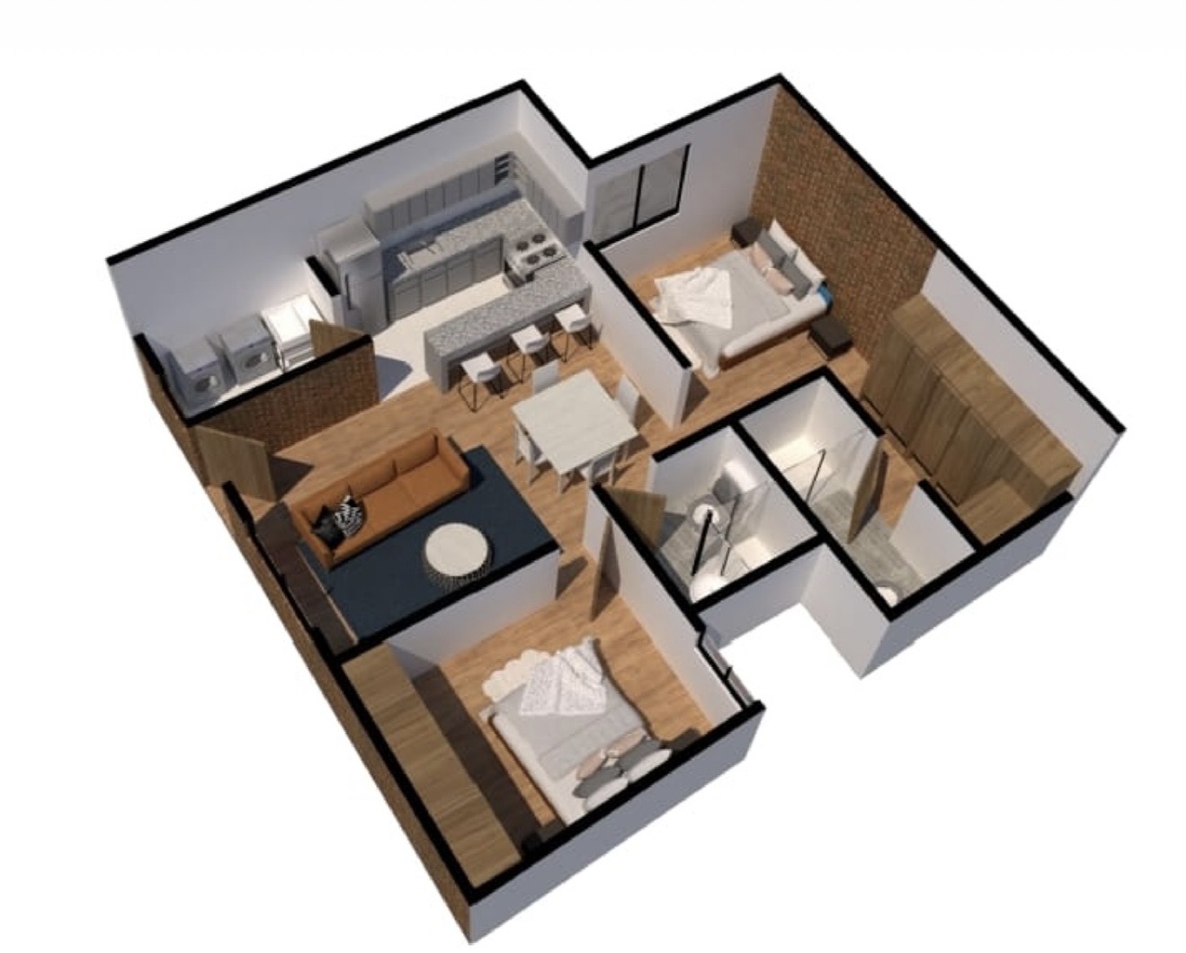 Proyecto de 16 departamentos distribuidos en 4 niveles, con diseño funcional que prioriza iluminación natural y óptimo aprovechamiento de espacios.